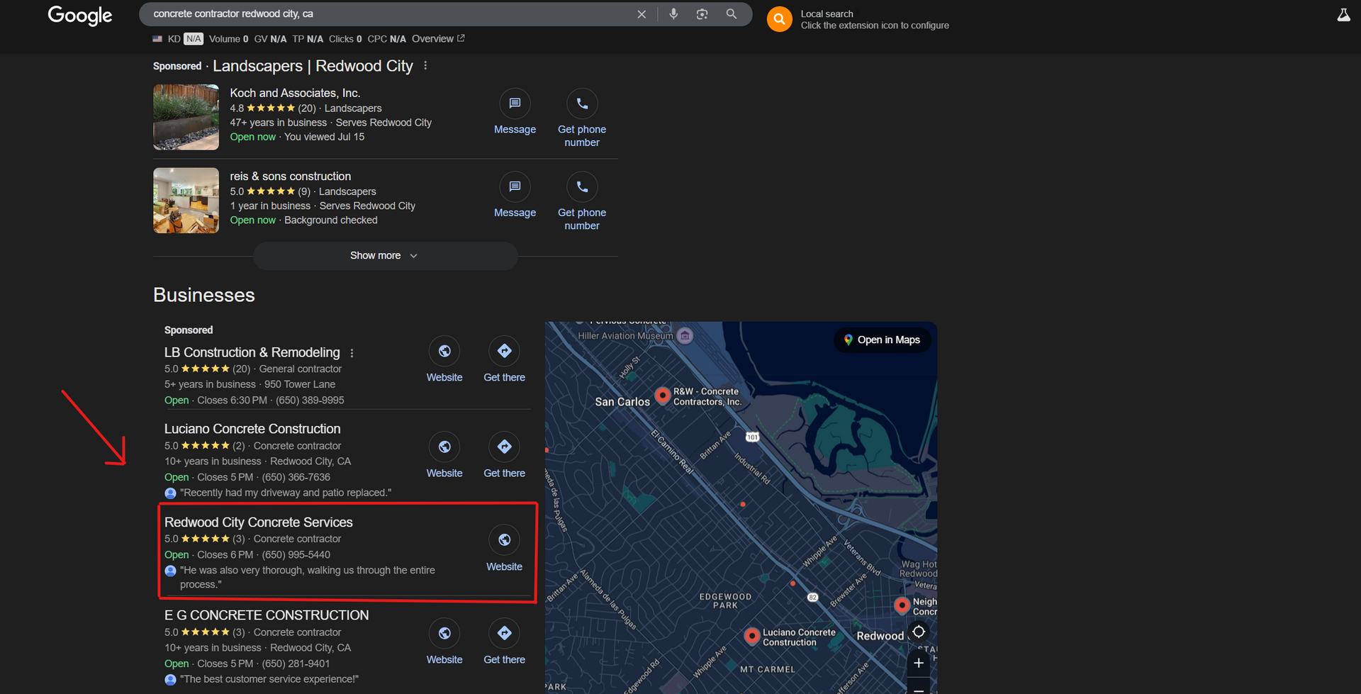 When someone in Redwood City searches for concrete services, they find my listing and they call that number.